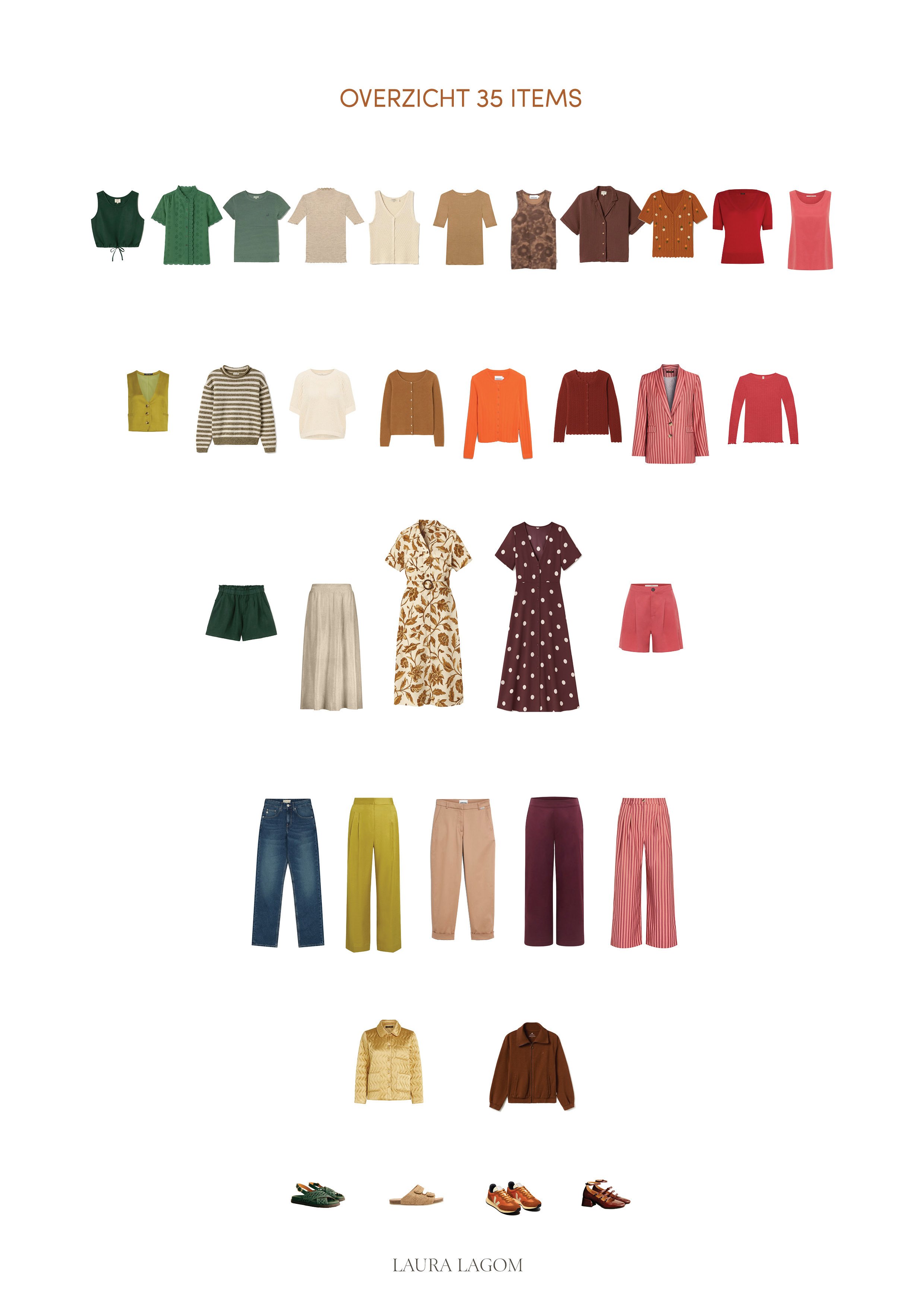 Een selectie van zo'n 35 kledingstukken, inclusief schoenen. Alle items passen bij elkaar én bij jou, waardoor je makkelijk veel combinaties kunt maken, passend voor iedere gelegenheid en weertype.
