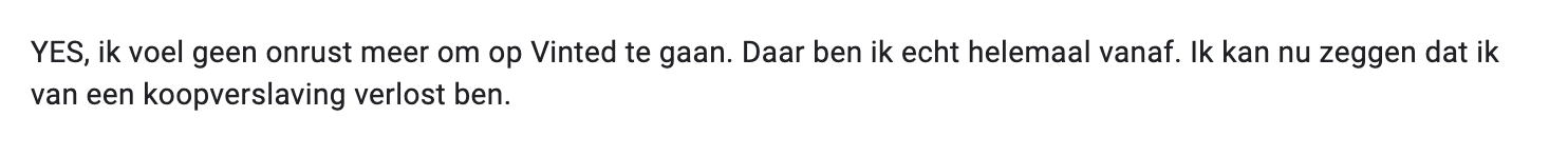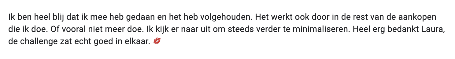 Afhankelijk van jouw situatie kan ik je in de cursus adviseren om voor het eerste jaar een Vinted-verbod te hanteren voor jezelf of om zelfs een jaar helemaal niets te kopen. Ik deed dit zelf in 2010 en dat heeft me heel veel geleerd over de kleding die ik écht nodig heb en over mezelf.